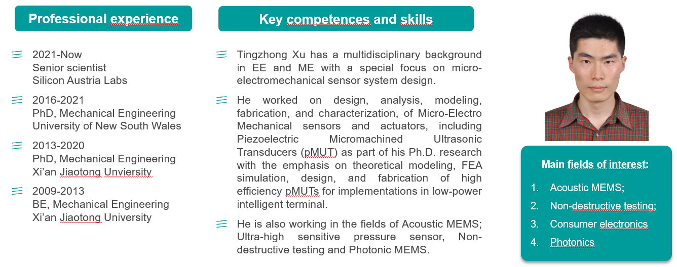 获得博士学位,并于 2021 年加入奥地利Siicon·Austria Labs GmbH.任高级研究员。主要开展压电MEMS,声学MEMS,传感器与执行器的建模与设计以及系统测试,在集成微纳系统和传感器领域权威期刊(TUFFC,·S&Aa, JMM, JPD, MST·等)以及业内顶级会议(MEMS, Sensors, Transducers, IUS)发表论文数十篇,并负责领导欧洲地平线项目子课题一项。