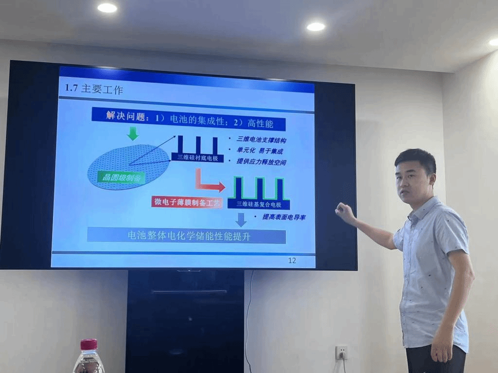 岳闯副研究员分别从如何通过不同MEMS硅基加工技术手段实现三维硅基微型储能器件衬底支撑结构的制备、如何利用微电子制造工艺调控微能源器件的储能性以及如何探究微能源系统储能特性的改善机理等方面展开讲解。基于以上关键技术的突破和创新,最终实现了对硅基微能源储能器件的性能大幅提升。