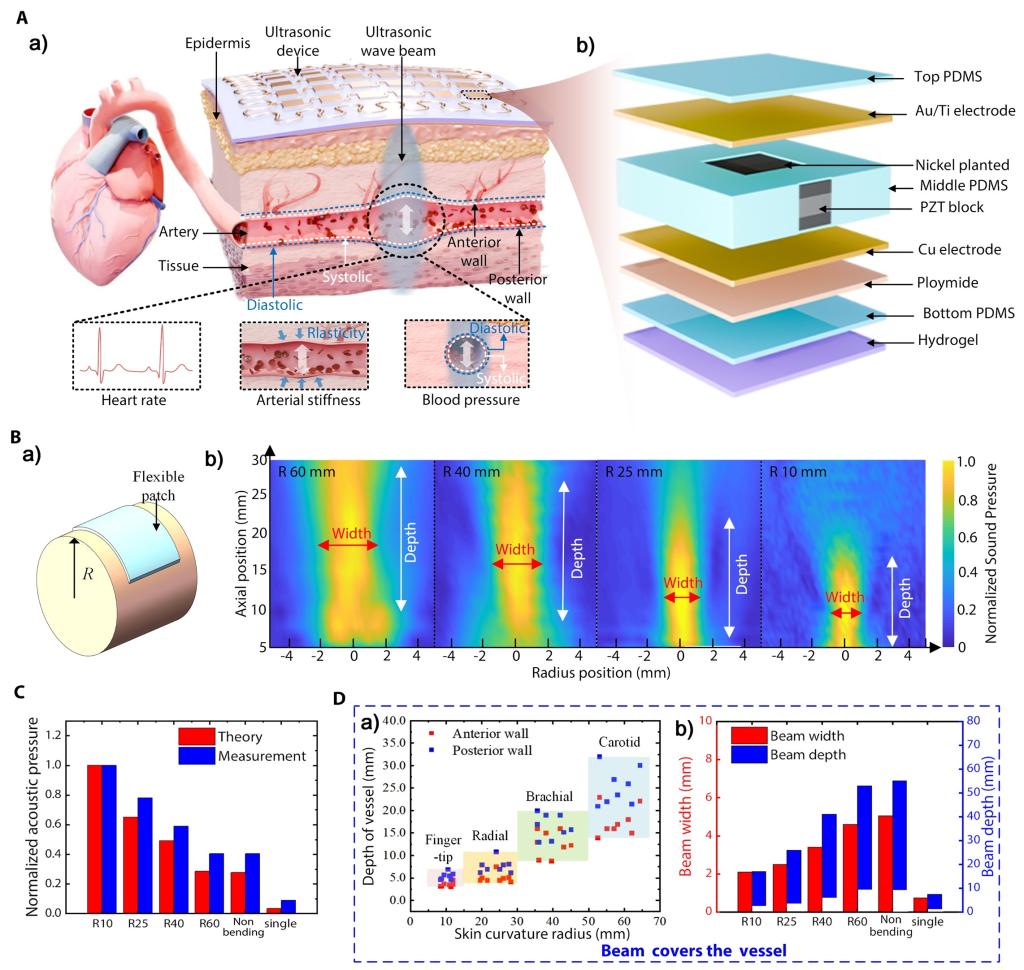 第一附属医院吕毅、吴荣谦教授团队等联合研发了一种皮肤自适应聚焦柔性微加工超声换能器阵列,可共形贴附于人体皮肤表面实现血压、心率、血管刚度等血流多参数的非侵入实时、连续检测,为心血管疾病的日常监测与早期预警提供了新技术、新希望。该研究提出了一种皮肤自适应聚焦超声(Skin-Adaptive Focused Ultrasound, SAFU)血流多参数测量方法,利用全阵元同相位激励超声和皮肤固有的曲率特性实现阵列发射超声波束的聚焦,形成“橄榄球状”声束,并基于皮肤曲率与皮下血管深度和尺寸的内在关系实现聚焦声束自适应调节。通过合理的阵列结构参数设计,所研发超声阵列的聚焦声束深度和宽度范围(波束宽度为2.1~4.6 mm,穿透深度为3.3~53 mm)可随皮肤表面曲率变化,有效覆盖指端动脉、桡动脉、肱动脉和颈动脉等人体典型动脉血管区域,实现高精度、高信噪比、宽深度范围血流参数检测。该SAFU技术可以大幅简化相控阵检测技术面临的换能器结构与控制电路系统的复杂性,提高可靠性;相对单阵元检测方法声压提高10.8倍、信噪比提高19.5 dB,兼顾了结构和性能优势,为基于超声飞行时间法的生理参数检测应用提供了理想途径(图1)。