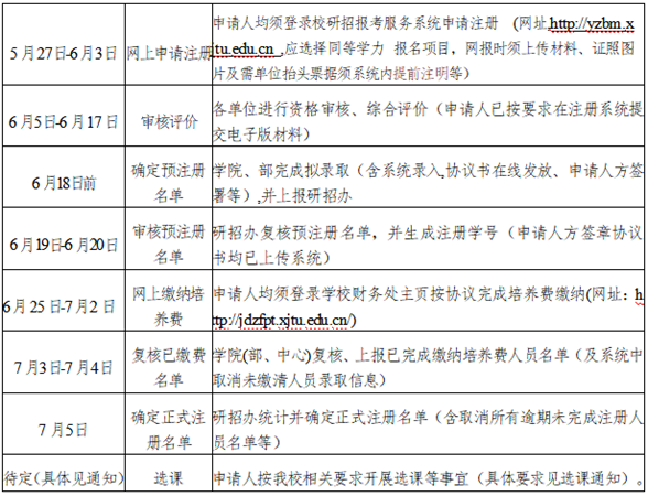 经研招办审核通过的申请注册人按照协议及接收单位具体通知要求,均须于6月25日-7月2日登录校财务处主页完成培养费网上缴纳(网址://jdzfpt.18daohang.net/)且本人保留缴费凭证截图以备查。按时在学校收费平台完成培养费全额缴纳后,本次申请方可生效。逾期未按时网上全额缴纳培养费者,均视为本人放弃本次注册。