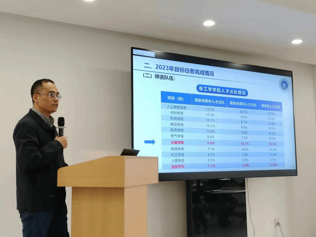 赵立波从2023年工作目标任务完成情况与2024年工作计划两个方面进行了总结汇报,展示了学院成立以来在组织机构搭建、师资队伍、科研工作、人才培养、学术与国际合作、经费支出方面的工作情况。他提出,2024年学院将继续推进高层次人才队伍建设,持续推进传感器国家工程研究中心共建、新增牵头或参与申请国家重大重点项目等,进一步破解高端仪器及相关器件的“卡脖子”技术难题。