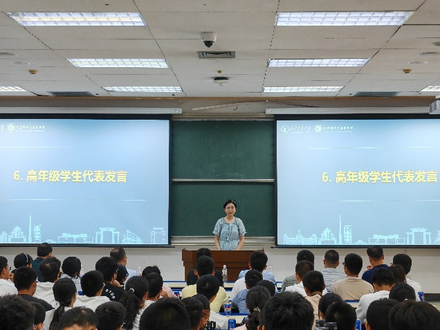 本科新生代表2403班李凯博倡议同学们主动踏出舒适圈,自立自强、自我承认并实现自我成长。高年级学生代表2303班陈诗歌同学分享了她入学一年以来的体会和感受,她鼓励学弟学妹们勇敢地体验大学生活,并坚信“办法总比困难多”,保持积极向上的心态。
