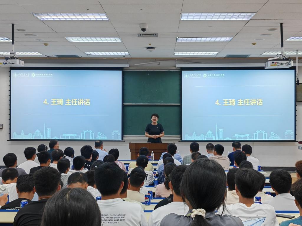 王琦主任全面介绍文治书院情况,并从三个方面寄语新生:一要持续保持对学习的热情;二要坚信自己,自信勇敢;三要学会主动探索。她建议同学们在遇到困难时主动寻求书院辅导员、学院教师的帮助,积极面对挑战。