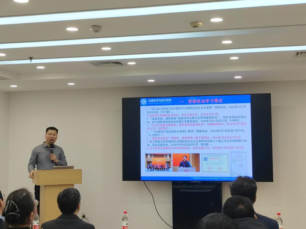 学院党委书记韦学勇教授首先代表学院领导班子作述职报告。他全面回顾了本年度党建工作,从完善基层党组织建设、开展党建学习、以党建助力业务发展、强化学院思想文化建设等方面展开,剖析现存问题的同时也展望了下一步工作计划。在个人述职环节,韦书记围绕完善基层组织推动基层党建发展,坚持理论学习提高履职能力,落实中心工作坚持党建引领发展,并就党管人才加强师资队伍建设、推动人工智能赋能仪器学科发展、扩大对外开放提高学科影响力、落实“6352”工程提高产学研深度融合、加强思想文化建设、推进全面从严治党等方面进行了述职汇报。