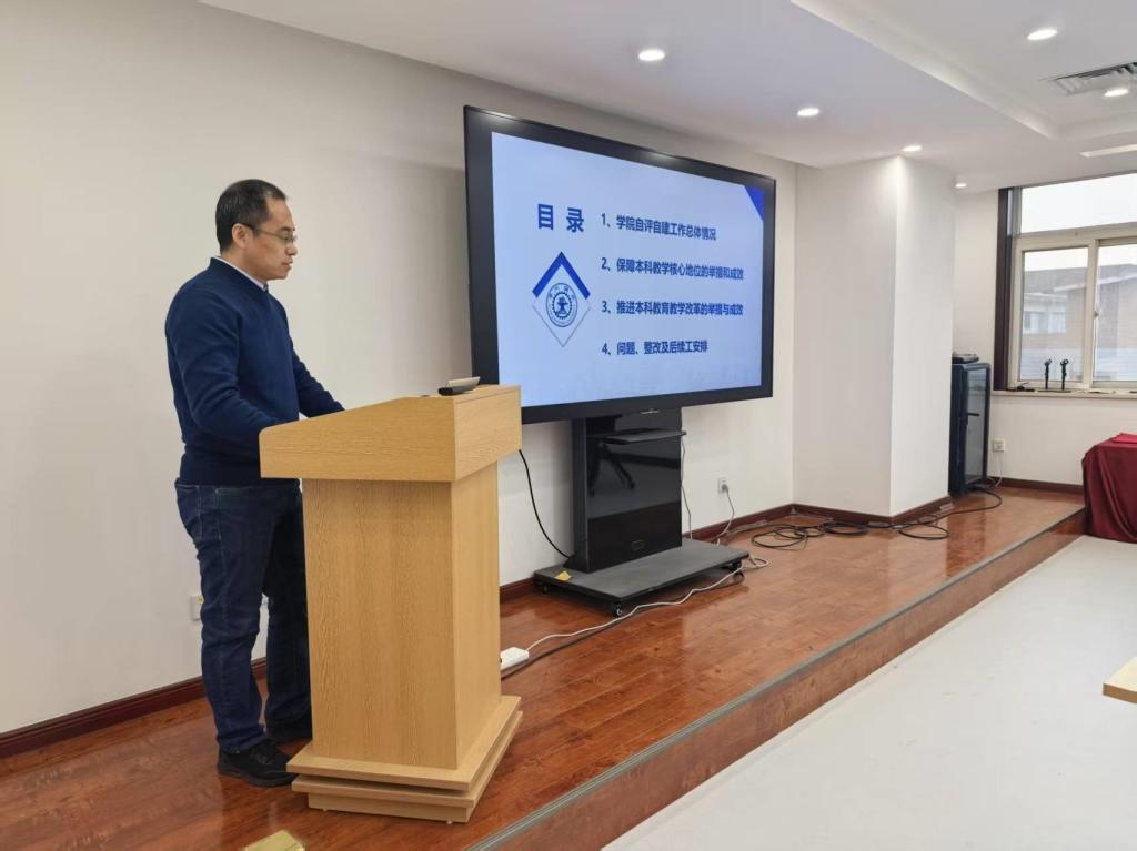 赵立波执行院长代表学院从自评自建工作总体情况、保障本科教学核心地位的举措和成效、推进本科教育教学改革的举措与成效、存在问题与整改进展等四个方面进行了全面汇报,并就下一步工作计划进行了说明。