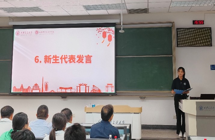 新老生代表发言。仪器类 2503 班李雨萱同学回忆了军训中的收获与经验,表示穿上交大蓝就是接过了接力棒,新同学们会将个人理想汇入学科发展,将个人发展融入时代洪流,乘风破浪,不负韶华,不负时代。测控(智能感知)2401 班韩煦阳同学则作为老生代表鼓励学弟学妹们努力学习,珍惜大学时光,从历史和校史中汲取力量,逐梦前进,用青春之力筑写华章。
